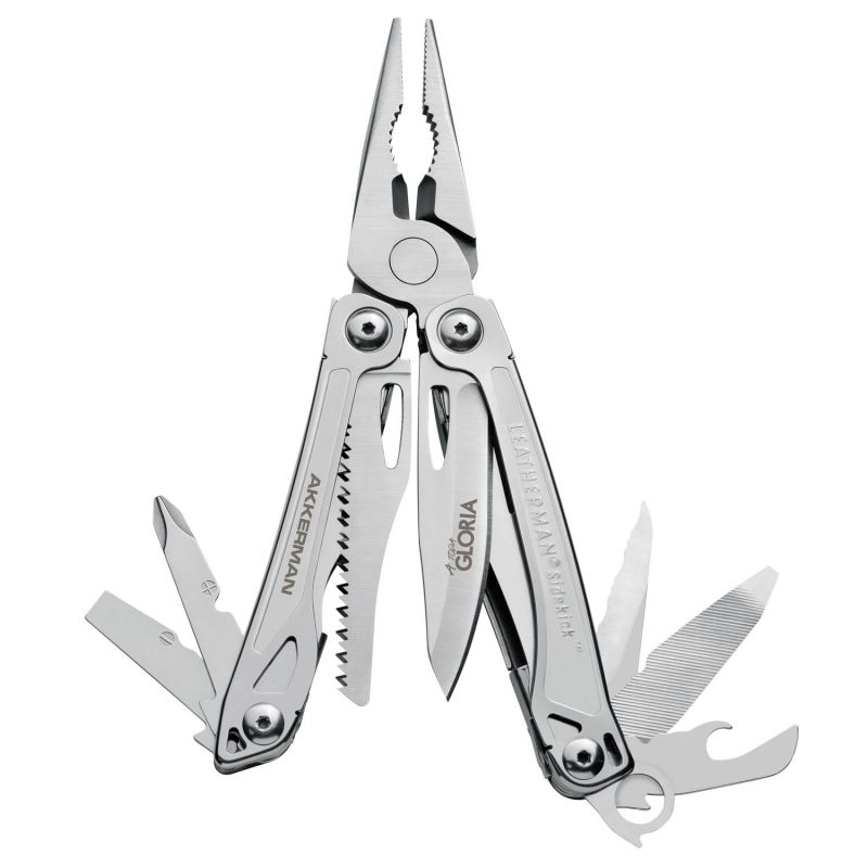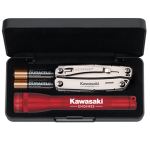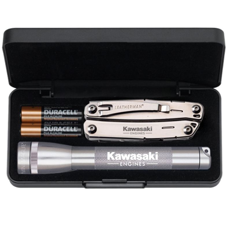 Two great brand names packaged together in a sleek presentation box. The 5.75″ M2A Mini Maglite comes with 2 “AA” batteries, shines brighter than flashlights of equal battery resources, and is available in black, blue, red, or gray. The all stainless-steel 4″ Leatherman Sidekick has 14 tools: Knife, serrated knife, three screwdrivers, ruler, saw, spring-action needlenose & regular pliers, wire cutters & stripper, bottle & can opener, wood/metal file. Comes with a removable pocket clip. Laser engraved. Complies with Prop 65.