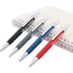 The Academy™ Pen is Designed to Fit Seamlessly With Your Existing Marketing Plans and Help Enhance Your Brand’s Image. This Saratoga™ branded pen offers a colored barrel with a silver plunger accent. The pen also features our Softex™ “soft touch” finish that provides a comfortable grip. Ergonomic grip design for added writing ease. Made of rABS materials making this an environmentally friendly option. Add your screen printed logo or message today. Complies with Prop 65.