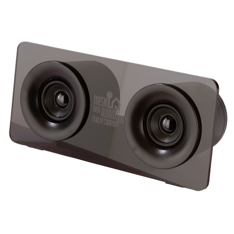 Marvel at the elegance of this acrylic, Bluetooth(R), dual 3 watt stereo speaker with built-in amplifier. It has a rechargeable lithium ion battery, charging cord, and 3.5mm cord for playing other wired devices. 9.375″ W x 4.3125″ H x 3.25″ D