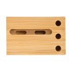 Elevate your space with the eco-conscious, multipurpose Allegra Phone Holder Amplifier crafted from 100% natural bamboo. This beautifully designed piece not only holds your phone and amplifies its sound, it also features three dedicated pen holes, making it a practical addition to any work or leisure space. Its smooth finish offers a touch of elegance, and the sustainable bamboo construction provides durability and a natural look. Perfect for hands-free viewing, it brings an organized, minimalist vibe to your desk, countertop, or vanity, all while naturally amplifying your favorite tunes. Its 3 3/8″ x 1/2″ Phone slot fits most standard size phones. Complies with Prop 65. 4 5/8″ W x 1 1/4″ H x 3″ D