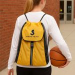 210D polyester drawstring bag with 90 gram non woven polypropylene- Durable cotton drawstrings- Features a front pocket for more storage- Lightweight and easy to useProduct Size: 13.5″ x 16.75″. 13.5″ W x 16.75″ H