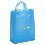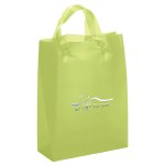 Colorful frosted hi-density plastic bags feature fused loop handles and a cardboard bottom insert. 8″ W x 4″ D x 10″ H