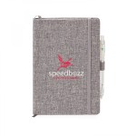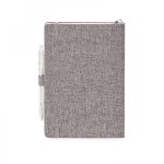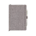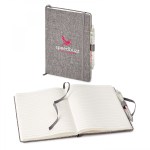 You will be impressed with the eco-friendly RPET Aqua journal with its textured cover made with 100% recycled water bottles. This journal has a gusseted pocket to hold your notes and the elegant grey cover is complemented by a matching ribbon bookmark and an elastic closure. To complete the combo, this non-refillable perfect bound notebook with 192 FSC acid-free cream colored lined pages includes a clear-colored, recycled EC112 Aqua pen attached to the pen loop. NOTE Only font size of 11pts or bigger are acceptable for decorating this item. Journal inner page dimension is 5 1/2″ x 8 3/16″ ComponentsEC112′,’EC357. 6″ L x 8.375″ W