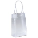 Frosted hi-density plastic bags feature macramé handles, a reinforced fold over top, and a cardboard bottom insert. 5″ W x 3″ D x 8″ H