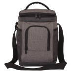 The Arizona cooler bag is made of grey two-tone 300D with extra durable two-tone 1680D polyester trims. The zippered main compartment has a heat-sealed PEVA lining and will hold up to 18 cans. It features an easy access front zippered compartment and two side mesh pockets provide extra outside storage. Carry it with the top padded handle or the 1 1/2″ x 48 adjustable shoulder strap. Complies with Prop 65. 8″ W x 12 1/2″ H x 8″ D