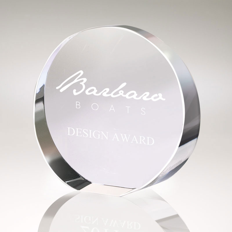Angle cut large crystal disc award. Complies with Prop 65. 5 1/2″ W x 5 1/2″ H x 1 3/8″ D