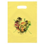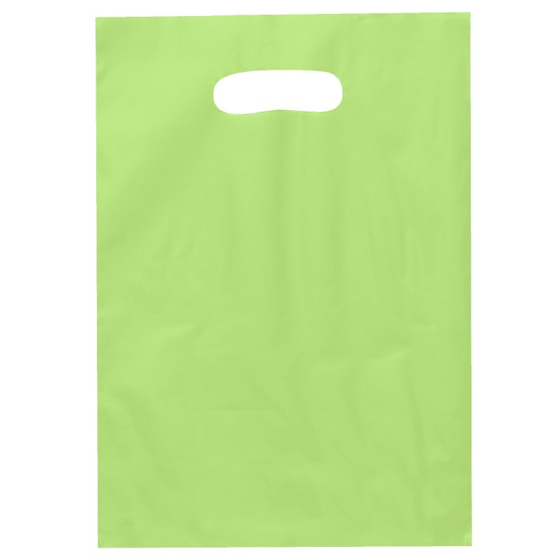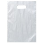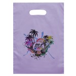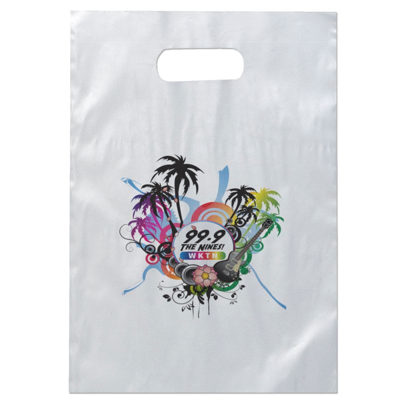 Colorful frosted hi-density plastic bag features die cut handles. Complies with CPSIA, C-TPAT, FDA, Prop 65. 9 1/2″ W x 14″ H
