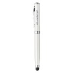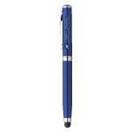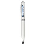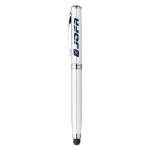 Four-in-one writing instrument with capacitive touch stylus; black ink ballpoint; led flashlight; and laser pointer. Removable metal stylus cap hides ballpoint underneath. Shiny color metallic barrel; includes clip; and silver accents. 4.75″ D x 0.5″ W