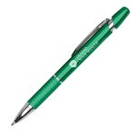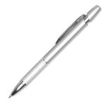 Plastic click-action ballpoint pen with chrome trim and texture d metal comfort grip.