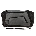 This bag is constructed of heathered melange polyester and features a zippered closure large main compartment, one front zipper pocket and two side zipper pockets, one mesh pocket on the back for quick access, and one side pocket that extends internally, which is ideal for dirty clothes or shoe storage. It also has removable and adjustable shoulder straps and contains cushioned backpack straps on backside that can be tucked under when using as a sports duffel bag or travel duffle bag. 9″ H x 21 1/4″ W x 9 1/2″ D