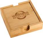 This tasteful Bamboo Coaster Set includes four bamboo coasters that each measure 4.50” x 4.50”, plus a stylish bamboo caddy to easily store each piece when not in use. The coasters stack neatly in the caddy and put your logo on prominent display. Decoration is available on all four coasters. Due to the nature of the bamboo material, variations in laser imprinting quality may occur. Packaged in a FSCr-certified giftbox. 1.50″ D x 4.50″ W x 4.50″ H