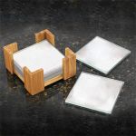 Six glass coasters nestle into a sturdy bamboo stand when not in use. Functional and attractive, the use of Bamboo makes this a Green gift option. Price includes same imprint on all coasters. Bamboo does not require the use of pesticides due to its natural antifungal, antibacterial properties. It is rarely attacked by pests or infected by pathogens. Bamboo is a grass that is capable of producing large, tree-like woody stems. Unlike trees which are killed when harvested, bamboo sends out shoots so it doesn’t need replanting. During peak growth periods, bamboo can grow from one to three feet per day. Bamboo reaches maturity within seven years – much more quickly than most tree species. 4.625″ W x 2.375″ H x 4.625″ D