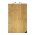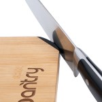 This large bamboo cutting board comes with a metal handle and a built-in knife sharpener. 9.0″ W x 15.5″ H x 0.6875″ D