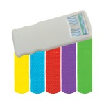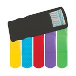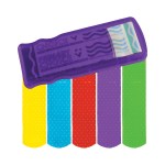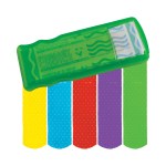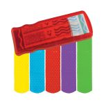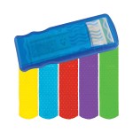 Convenient, easy-to-refill design includes 5 assorted latex-free colored bandages. Bandages available in solid yellow, blue, green, red or purple. If not specified, assorted color bandages provided. 4 3/16″ W x 1 5/8″ H x 3/8″ D