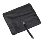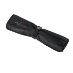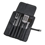 Six-piece grill tool set features: extra-long spring loaded tongs, long 2-prong fork, 11″ carving knife, extra-large spatula with a serrated edge, and a cleaning tool with brass bristles. Packaged in roll-up stay-clean pouch with buckle closure. All tools feature scratch-resistant coating. 18.75″ D x 5.5″ W