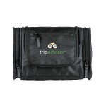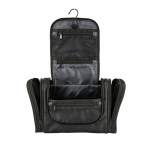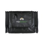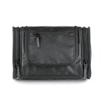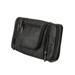 1680D/PVC cross weave outer with 210D lining travel kit hanging hook. Main compartment with interior organization; front zip pocket; side grab handle. 4″ D x 8″ H x 12″ W