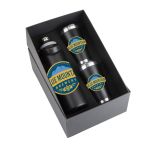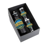 Three-piece Basecamp gift set includes the Basecamp Mega SP Tundra Bottle 40 Oz., and two Basecamp Pint Glasses inside a matte finished black gift box.