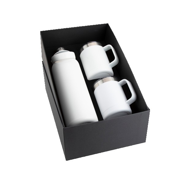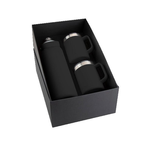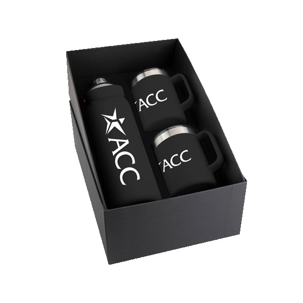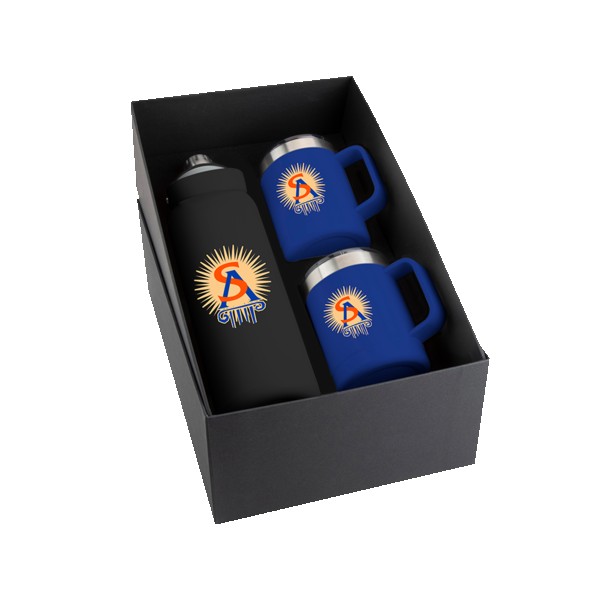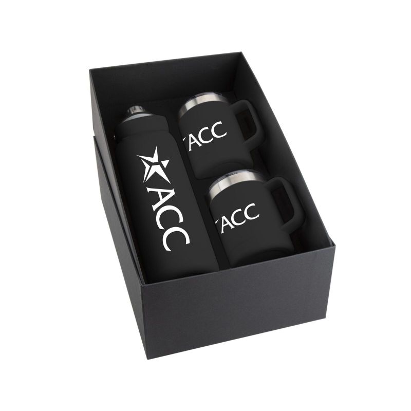 Three-piece Basecamp gift set includes the Basecamp Mega SP Tundra Bottle 40oz, and two Basecamp Zion’s inside a matte finished black gift box.