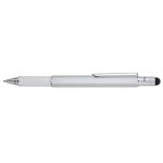 Twist-action ballpoint with textured metal grip, spirit level, 3″ ruler, small Phillips and flathead screwdriver and a capacitive stylus that works with touch screen devices. Complies with Prop 65. 1/2″ W x 5 3/4″ H x 5/16″ D