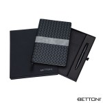 The discerning Cetara Executive Giftset by Bettoni includes a junior size notebook with stylish soft leatherette woven patterned cover and a coordinating twist-action heavy-weight brass ballpoint writing instrument with USA-made black ink refill. The notebook has 80 lined cream-colored pages and a black bookmark ribbon. Expertly crafted, this beautiful timeless gift option comes packaged in an elegant two-piece black giftbox. Complies with Prop 65. 7 3/4″ W x 8 3/4″ H x 1″ D