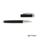 The Lazio Rollerball Pen from Bettoni is crafted from recycled brass and includes an easily replaceable ink cartridge, promoting sustainability while ensuring exceptional durability. Its sleek design features a sturdy spring clip and chrome trims and an elegant subtle diamond patterned lower barrel that add a touch of elegance to your writing experience. Filled with smooth black ink, and a balanced weight, this cap-off writing instrument delivers a consistent and enjoyable writing experience. Perfect for both professional and personal use, this pen combines style, functionality, and eco-friendliness in one elegant package. Complies with Prop 65. 11/16″ W x 5 3/8″ H x 1/2″ D