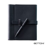 The Bettoni Sorrento Giftset is a classically styled executive gift. The included notebook has a soft leatherette cover with tri-fold construction, a unique gear-inspired strap closure, 40-page replaceble notepad with blank white paper, five interior slip pockets and an elastic pen loop. The heavy-weight brass twist-action ballpoint writing instrument has a beautiful combination of matte and gloss black features with an etched barrel and includes a USA-made black ink refill. The Sorrento Giftset comes beautifully packaged in a soft-touch two piece black box. Complies with Prop 65. 9 1/4″ W x 9 1/2″ H x 1 5/8″ D