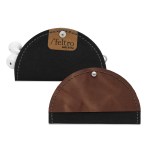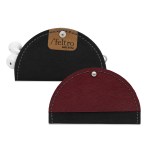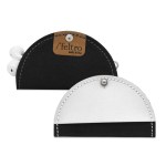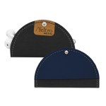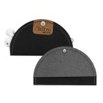 Leather and recycled black felt two tone Tech Taco. Easy to use and protective holder for all earbuds; simply roll the cord around 4 fingers, set it in the holder and close! Imprint area 16 square inch per location. 4″ in diameter , 4″ x 2″ once closed. Matte silver knob closure. Made in USA. Complies with FSC, Prop 65. 4″ Diameter