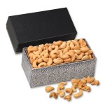 Will the gifts you select today be remembered a year from now? The answer is an easy “Yes, and even longer!” if you choose our Extra Fancy Cashews. Each lucky recipient will get three-quarters of a pound of those great big, great tasting, freshly roasted Cashews – the very finest in the world – specially packaged to preserve freshness and presented in a black and silver gift box with your logo foil-stamped on the lid in silver. Complies with CPSIA, FDA, Prop 65. 7.375″ L x 3.875″ W x 2.25″ H
