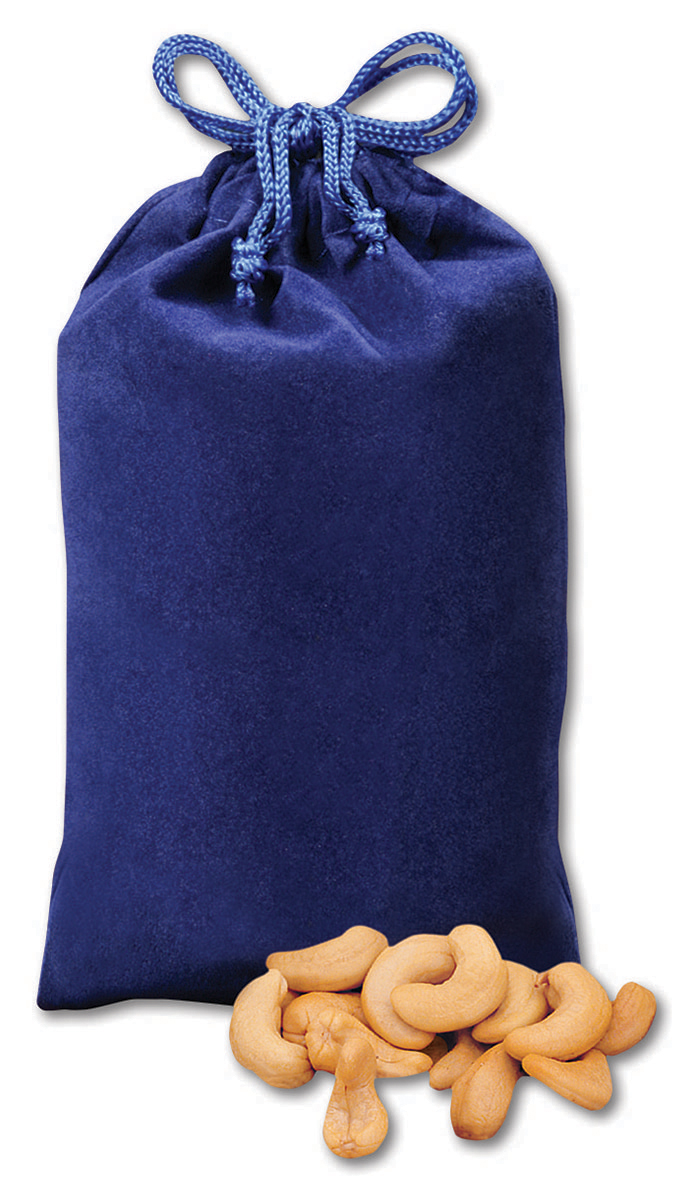 Exquisite things come in small packages. This rich blue velour pouch is foil-stamped in gold with your logo and packed with five-ounces of Extra Fancy Jumbo Cashews. To assure freshness, our products are packed in our traditional air-tight bags within the velour pouch. Complies with CPSIA, FDA, Prop 65. 7″ L x 5″ W