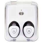 Operating range 33ft/10m Approx 1 hours of playtime Music (stereo), hands-free calls (mono) Square white storage case with clear flip-top lid charges stylish Bluetooth wireless earbuds Recharge time: 2 hours. 1.375″ D x 2.25″ W x 2.625″ H