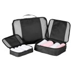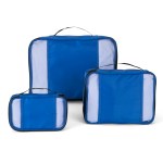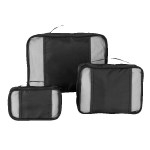 Three-piece 420D polyester and polyester mesh packing cubes. Features three different sizes; covered piping to keep their structure; top webbing handle; zipper closure. Small: 8″ L × 5″ W x 2″D Medium: 11″ L × 7.5″ W x 4″D Large: 15″ L × 10″ W x 3″D. 14″ D x 3″ H x 10″ W