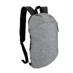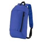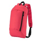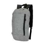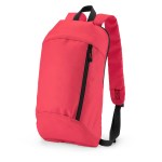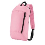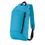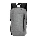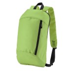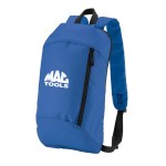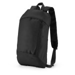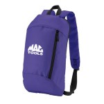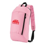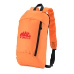 600D/210D lightly padded backpack. Front zipper pocket and main compartment; adjustable shoulder straps and top grab handle. 6.3125″ D x 15.75″ H x 9.4375″ W