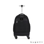 Lighten your load with the Bugatti Lucas Backpack on Wheels! This versatile bag is made from durable thick-woven polyester and offers plenty of pockets to store your gear while on the move. Roll it easily with the telescoping T-bar handle and 4 spinner wheels, or unzip the back flap to utilize the hideaway padded backpack straps to carry the bag hands free. The back flap doubles as a wheel cover to protect your clothing while wearing the bag and its side mesh pockets hold water bottles or other accessories needed close at hand. The main compartment has a padded pocket that fits most 15.6″ laptops, and compression straps to hold clothes or files in place. Its front zippered compartment features an organizer with multiple pockets and stretch straps and a protective RFID zippered pocket. Great for everyday commutes, travel and tradeshows, show up in style and give your back a break with the Lucas Backpack on Wheels. Complies with Prop 65. 13″ W x 21″ H x 7 1/2″ D