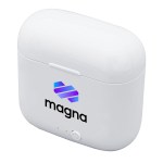 True wireless earbuds housed in a 350 mAh recharger case Connect via Bluetooth V 5.0 Indicator lights display charging levels: red flashing for charging and solid red when fully charged (case), blue flashing on earbuds when recharging in case Auto pairing capability Operating range 33ft/10m Superior, simulated stereo sound Charging case charges earbuds up to 3x Built-in mic/touch controls Up to about 300 hours of standby time Up to 2 – 3 hours of play/talk time Includes micro-USB charging. 1.125″ D x 2.25″ W x 2.375″ H