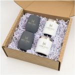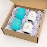 The Perfect Tumbler Set to Wind You Up or Wind You Down! Each kit is packaged individually in an attractive patterned craft mailer with craft crinkle paper for filler. Add your custom message or logo to each item in the kit. Each set includes 2 of each: 12 oz. Café To Go Coffee Mug and 12 oz. Cruise Wine Tumbler . Perfect to give to new staff, team members, students or clients. Complies with Prop 65.