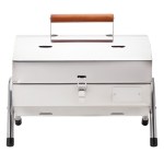 Stainless steel portable BBQ grill with two 13 1/4″ x 8″ grilling surfaces, two chrome plated briquette grills, wood carry handle, hinged lid, vent holes and steel legs with protective end caps. Complies with Prop 65. 16 1/2″ W x 14 1/2″ H x 11″ D