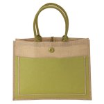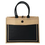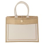 Large two-tone tote made from jute fiber. It features a wide 5 1/2″ gusset, large cotton front pocket with hook & loop closure, 20″ handles and a button and loop closure. Complies with Prop 65. 18 1/4″ W x 14″ H x 5 1/2″ D