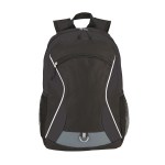This 600D backpack features a large main compartment with a padded pocket that will hold most 15″ laptops, a zippered front compartment, two mesh side pockets, and a metal D-ring. The bag also features 420D honeycomb patterned trim, white accent trim, reflective D-ring holder a carry handle, padded back and adjustable padded mesh backpack straps. Complies with Prop 65. 11 1/2″ W x 17 3/4″ H x 5 3/4″ D