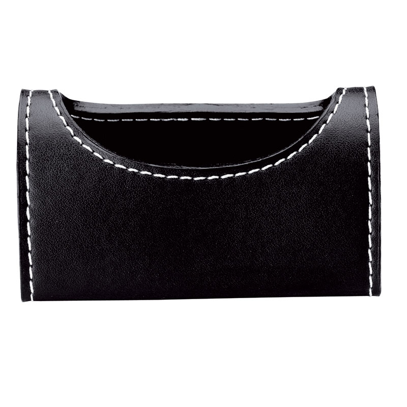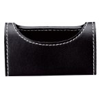 Black leatherette folding desktop cell phone holder with white contrast stitching. Folds flat and fits in No. 10 envelope for easy mailing. Interior Width is 2 11/16″. Complies with Prop 65. 3 1/2″ W x 7″ H x 1/8″ D