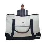 Whether you’re headed to the shore or the park, this fashionable tote carries everything you need while keeping you organized. The sophisticated style and thoughtful details make it the perfect accessory for the stylish, savvy beach-goer. Durable, eco-friendly canvas and a roomy interior mean this bag is ready for all your seaside adventures. With its standout stripe interior and gold twist lock closure, this tote adds a touch of class to any summer outing. 13″ L x 21″ W