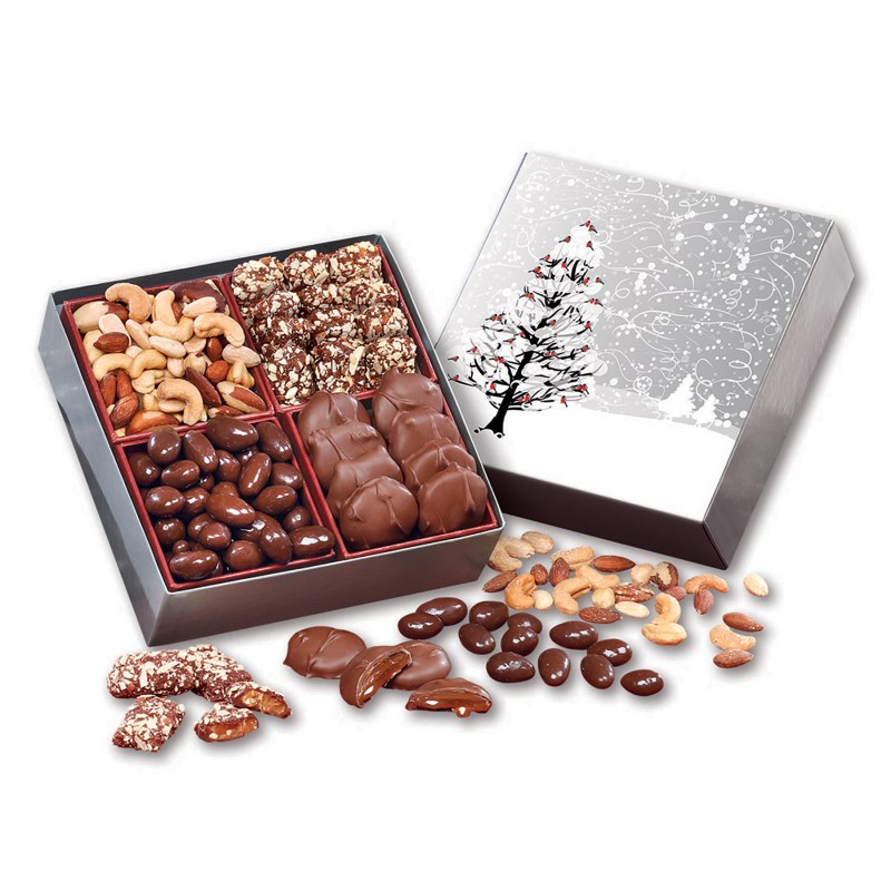 This silver gift box comes wrapped with a sleeve decorated with a splendid scene of cardinals in a snow-covered tree. The sleeve features your imprint in one of six colors. It is practically overflowing with delicacies everyone will be thrilled to receive: smooth Milk Chocolate Almonds, mouth-watering Caramel Pecan Clusters, crunchy and buttery English Toffee and fresh-roasted Deluxe Mixed Nuts. Almost one and a quarter pounds of gourmet treats! Complies with CPSIA, FDA, Prop 65.