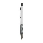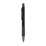 The Carnaby Plunge-Action Aluminum Ballpoint pen has a soft touch rubberized finish and smooth-writing black ink refill. Its standout feature is the strategically placed dotted grip along the barrel, providing added comfort, control, and reduced hand fatigue. The tactile sensation of the dots ensures a firm grip, making it enjoyable to use for notetaking or journaling. With durable construction, a retractable mechanism, an integrated stylus tip and gunmetal trims, this pen combines functionality, durability, and aesthetics for a seamless writing experience. Elevate your writing with the exceptional Carnaby ballpoint pen. Complies with Prop 65. 7/16″ W x 5 5/8″ H x 1/2″ D