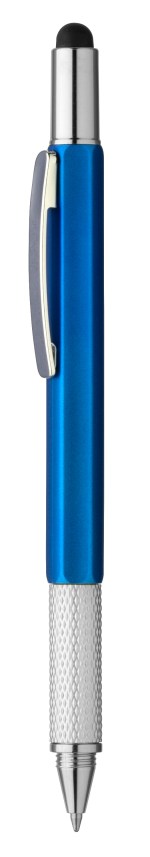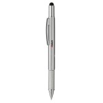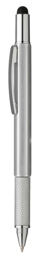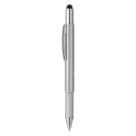 Multi-function level tool pen with stylus, level, flathead screwdriver, Phillips head screwdriver, us ruler and metric ruler. 5.875″ D x 0.375″ W
