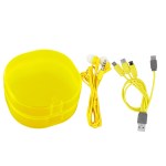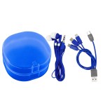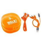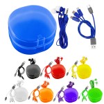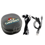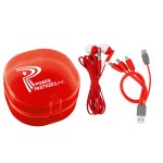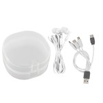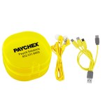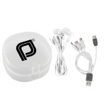 Sleek and durable plastic case with a convenient snap closure. Vibrant travel ear buds for a pop of color on the go. Includes a versatile 4-in-1 charging cable with multiple USB adapters. Compatible with IOS devices, Micro USB, and Type C USB, all protected by a patented design. Features both USB and Type C USB inputs for seamless charging. Complies with CE, Prop 65. 2.75″ L x 2.75″ H
