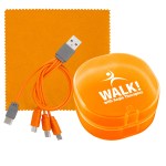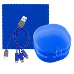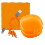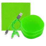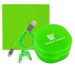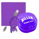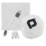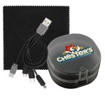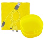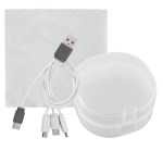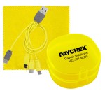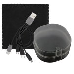 Elegantly designed plastic case featuring a secure snap closure. Includes a vibrant 5 x 5 recycled PET cleaning cloth and a versatile 4-in-1 charging cable with multiple USB adapters. This innovative product is compatible with IOS devices, Micro USB, and Type C USB, all backed by a patented design. Equipped with both USB and Type C USB inputs for ultimate convenience. Complies with CE, cUL, FCC, Prop 65, UL. 2.75″ L x 2.75″ H