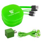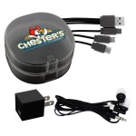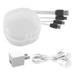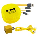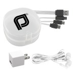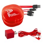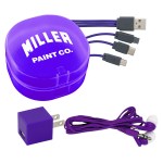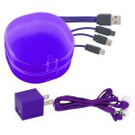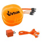 Introducing the vibrant Colorful Ear Bud Carry All, complete with matching ear buds for a stylish and convenient listening experience. The UL Square USB Wall Charger is not only sleek and modern, but also UL Listed and Patented for your peace of mind. Say goodbye to tangled cords with the Colorful 3-in-1 charging cable, featuring a Multiple USB adaptor for ultimate versatility. This cable is compatible with IOS devices, Micro USB, and Type C USB, making it the perfect all-in-one charging solution for all your devices. Stay connected and charged up in style with this must-have tech accessory bundle. Complies with Prop 65. 2.75″ L x 2.75″ H