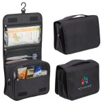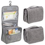The Carry-All Toiletry Bag is made of 300D heathered polyester and provides an easy way to organize and pack! Four internal organizing pockets in the main compartment with a mesh panel and zippered pouch on the front, and 2 zippered pockets on the top flap of the interior section provide ample space for all of your toiletries. The plastic hanger and hook-and-look closure on the handle make for easy use and display. Complies with Prop 65. 9.5″ L x 3.5″ W x 7.875″ H