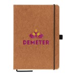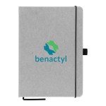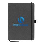 Introducing our Carson Recycled PU Leather Notebook – it’s ideal for journaling at home and meetings at work. The hard cover is made from 75% recycled leather and 25% plastic. the 80 sheets (160 pages) of 70 gsm renewable, recycled paper are ivory colored and lined recycled paper. This stylish notebook features a ribbon marker, stitched binding, elastic strap and pen loop (pen not included). Your logo will be . Complies with Prop 65. 8.27″ H x 5.83″ W x 0.59″ D