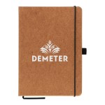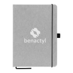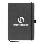 Introducing our Carson Recycled PU Leather Notebook – it’s ideal for journaling at home and meetings at work. The hard cover is made from 75% recycled leather and 25% plastic. the 80 sheets (160 pages) of 70 gsm renewable, recycled paper are ivory colored and lined recycled paper. This stylish notebook features a ribbon marker, stitched binding, elastic strap and pen loop (pen not included). Your logo will be . Complies with Prop 65. 8.27″ H x 5.83″ W x 0.59″ D
