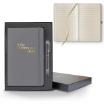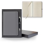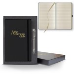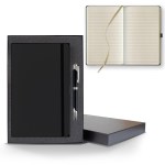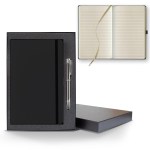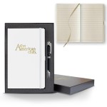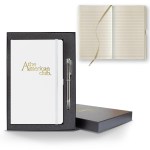 Write down all the day’s thoughts inside this medium sized journal! Measuring 5 1/4″ x 8 3/8″, each journal features a high-grade polyurethane construction featuring a smooth surface with a matte finish. It’s FSC® certified and comes with a sleek black gift box and comes a black or gun metal pen. Red, White, & Blue pens are also available upon request. Also included are a pen loop, elastic closure, 224 lined ivory pages, back expandable pocket and gold ribbon marker. Customize the cover with an imprinted company name, logo or marketing message for brand exposure. Great for meetings, business seminars and much more! FSC MIX 70% CQ-COC-000479. 5.25″ W x 8.375″ H x 0.5″ D